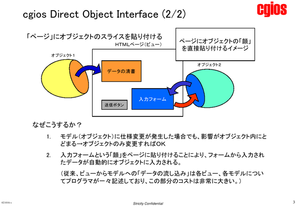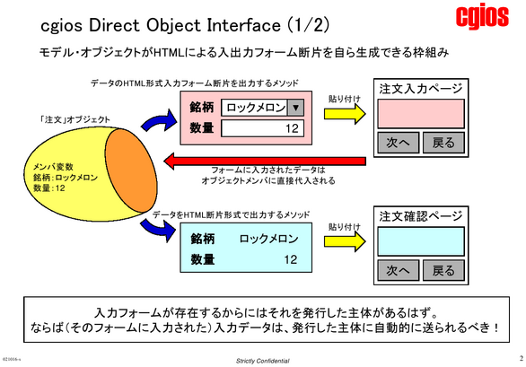 というわけでタイトルの「フォーム台帳」なんですが、これはどういう仕組みかというと、 オブジェクト指向でいうところのオブジェクト、つまりクラスのインスタンスが、 自身のメンバへの入力をブラウザ側から受け取りたいとき (例えばユーザ情報を扱うクラスがユーザデータつまり名前とかメールアドレスとかを入力させたいとき) オブジェクトが直接「入力フォーム」を発行し、それがフォーム台帳に登録され、 ブラウザからデータが返ってきたときにフォーム台帳が自動的にデータを仕分けて 「聞いたオブジェクト(つまり入力フォームを発行したオブジェクト)」のメンバに直接入力値をセットする という仕組みです。もう本当に意味わかんないですね。すみません。